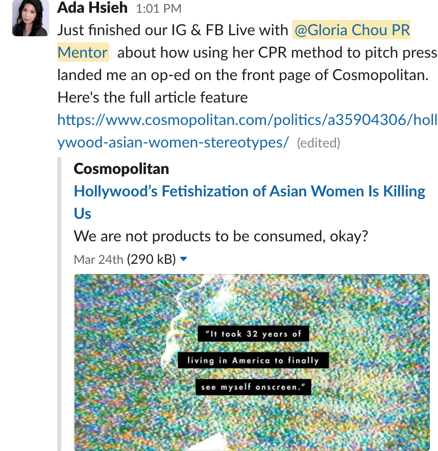 Ada pitched using the CPR method, got a response, and Cosmo offered her to write an op-ed with their in-house editorial team. Now, she not only knows 3 people at Cosmo she’s written this with, she has also showcased her wealth of experience in this beautifully written piece that is very personal to her and so many Asian women. “This pitch is so personal and it doesn’t do it justice unless you do it from your own experience”, Ada shared at the Facebook live that took place in the “Small Biz PR Pros” Facebook Group on April 16. –Click HERE to watch the replay of her interview.