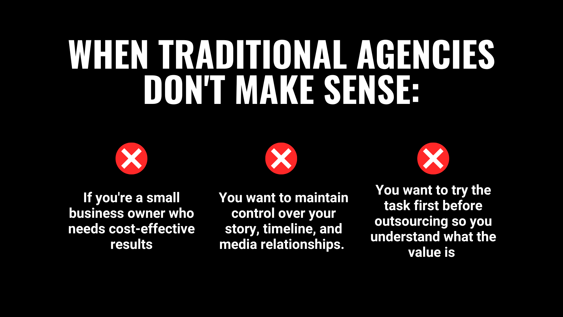 When agencies still make sense: If you’re launching a major product with a seven-figure marketing budget, dealing with crisis communications, or coordinating complex campaigns across multiple markets.