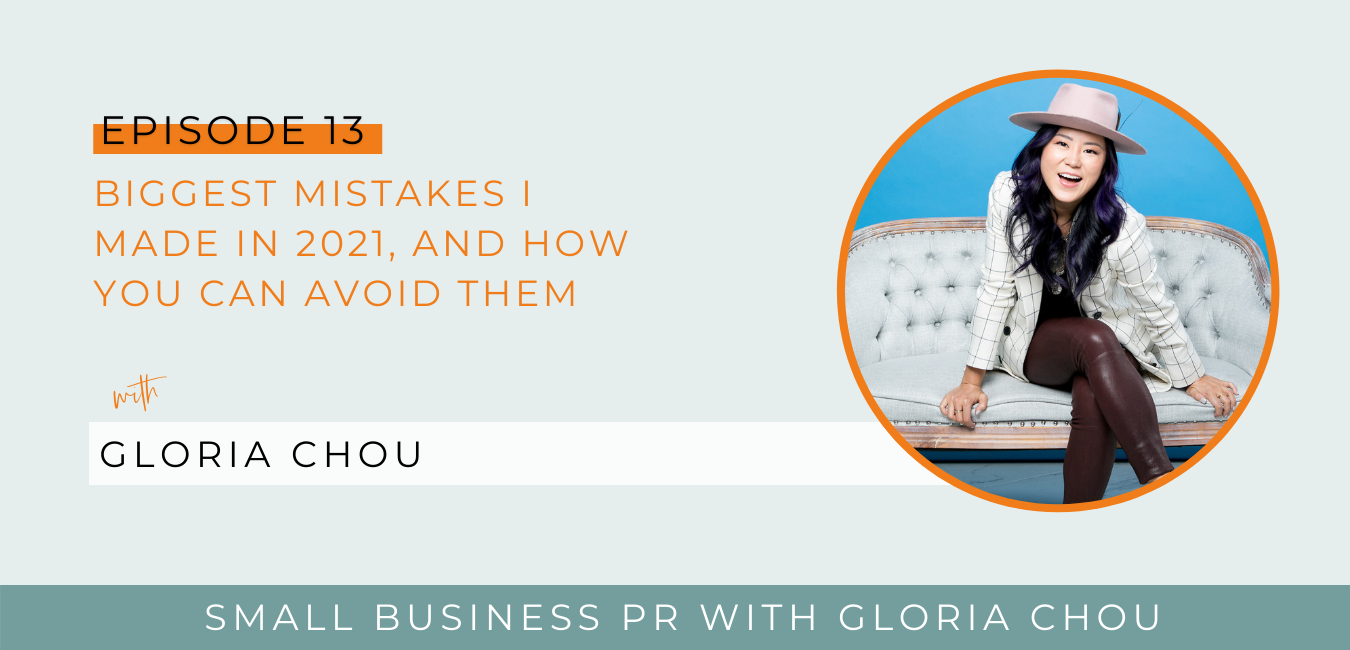 Speaker1: [00:00:00] Well, you guys, what a year it’s been in this episode, I am breaking it down and getting real vulnerable with you to share the biggest lessons in mistakes I made this year in hopes that it can inspire you and guide you as you make decisions for the new year. Let’s get started. Hey, friends, I’m Gloria Chou. Small business PR expert, award winning pitch writer and your unofficial hype woman. Nothing makes me happier than seeing people get the recognition they deserve, and that starts with feeling more confident to go bigger with your message. Because let’s be honest, we simply cannot make the impact. We’re here to make by hiding behind the scenes. So on this podcast, I will share with you the untraditional yet proven strategies for PR marketing and creating more opportunity in your business. If you are ready to take control of your narrative and be your most unapologetic and confident self, you’re in the right place. This is a small business PR podcast. So, you know, they say in the world of entrepreneurship, one day could seem like a week and a week could seem like a month and so on. There’s so much that happens in our business, right? So many failures, so many ups and downs. And I could not let this year go by without doing an episode about the biggest mistakes, the biggest lessons that I learned in Twenty Twenty One. I want to get real vulnerable with you.