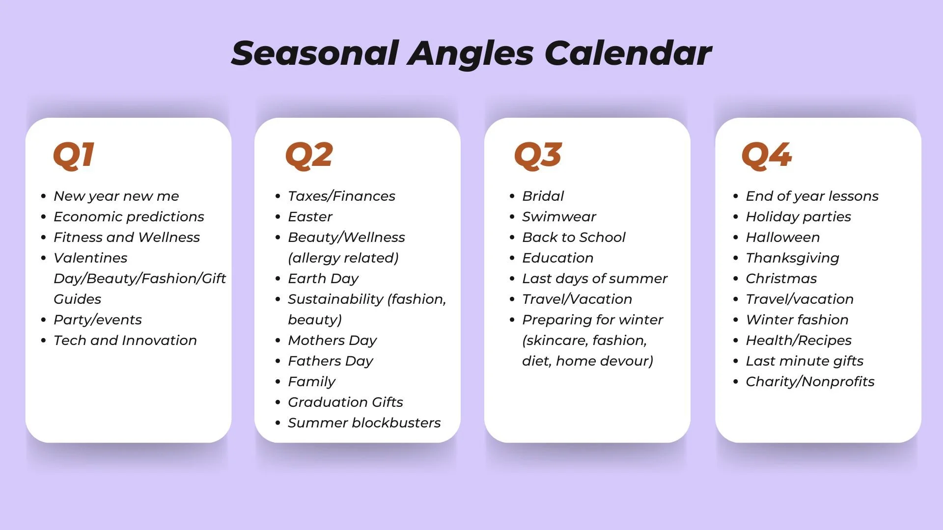The Seasonal Opportunity Calendar: Understanding when to pitch for different holidays and seasons – from Valentine’s Day and Mother’s Day to back-to-school and the end of year holiday season. (And it doesn’t always have to be a holiday. Think birthdays, anniversaries, reunions, these are happening daily).