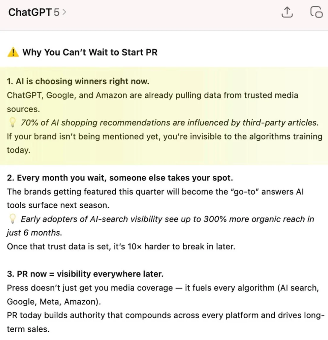 That’s why PR works so well in this environment. Every time a journalist writes about your product, every time you’re included in a gift guide, every time someone interviews you on a podcast—that’s a third-party endorsement. That’s someone else saying “this brand is worth paying attention to.” And AI weighs that way more heavily than your own marketing copy.