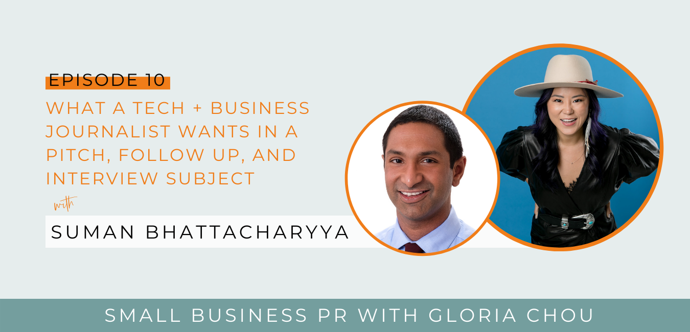 Speaker1: [00:00:00] Have you ever wondered what a technology and business reporter at some of the most top-tier outlets, such as a Wall Street Journal looks for in an interview? What they want to see in a pitch and how they feel about follow ups, then my friends, you’re not going to want to miss this episode. Hey, friends, I’m Gloria Chou, small business PR expert, award winning pitch writer and your unofficial hype woman. Nothing makes me happier than seeing people get the recognition they deserve. And that starts with feeling more confident to go bigger with your message, because let’s be honest, we simply cannot make the impact. We’re here to make by hiding behind the scenes. So on this podcast, I will share with you the untraditional yet proven strategies for PR marketing and creating more opportunity in your business. If you are ready to take control of your narrative and be your most unapologetic and confident self, you’re in the right place. This is the Small Business PR podcast. All right, everyone, I am so excited for today’s episode. This one is one that so many people ask me about, and I know that when it comes to small business PR, it’s all about making sure that you can get through to the journalists, right? They are the gatekeepers. And I’m so excited that today we have an incredible journalist with so much experience here actually answering the questions we’re dying to ask him. So without further ado, welcome to the show, Suman Bhattacharyya. Thank you so much for being here.