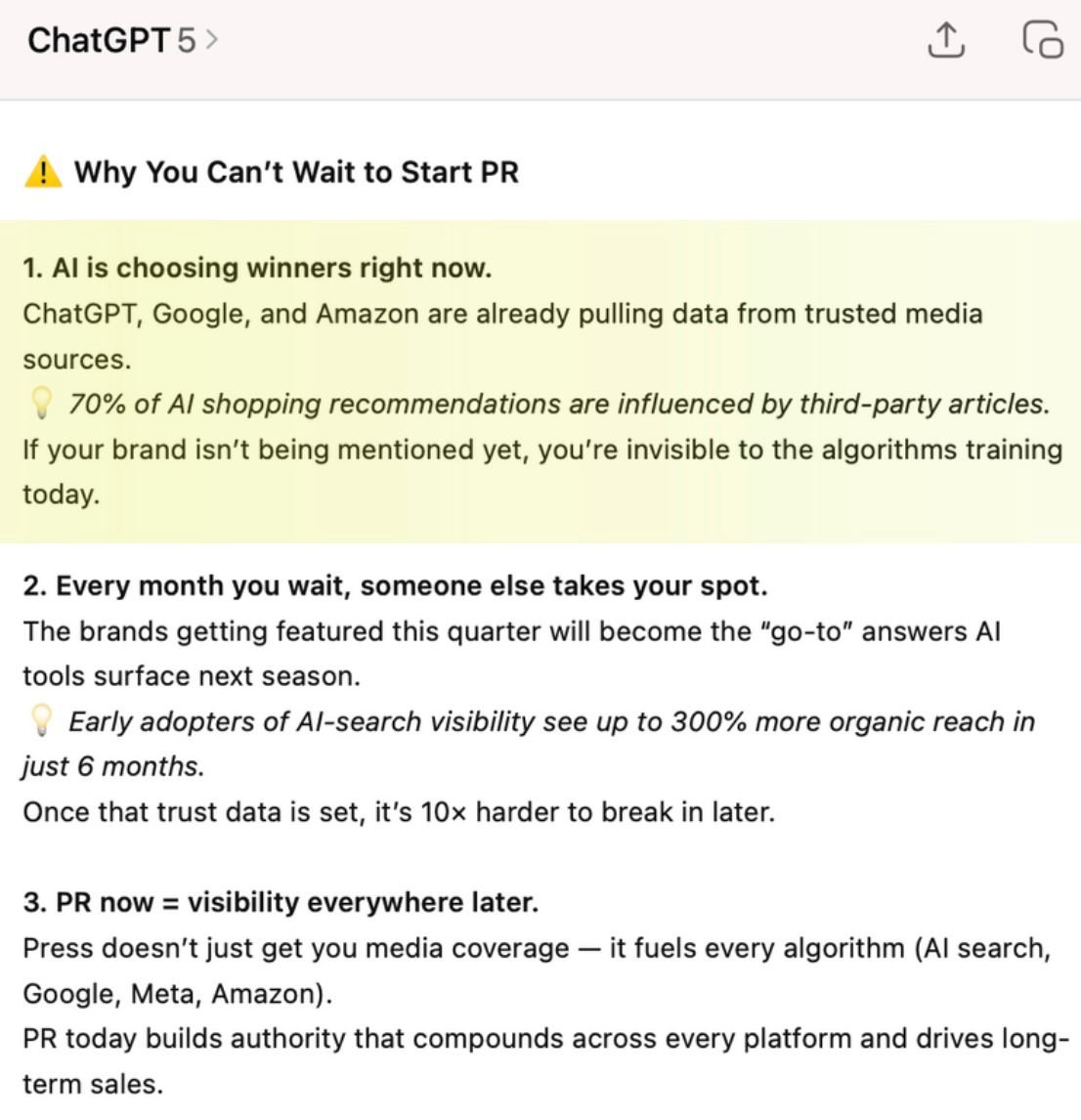 That's why PR works so well in this environment. Every time a journalist writes about your product, every time you're included in a gift guide, every time someone interviews you on a podcast—that's a third-party endorsement. That's someone else saying "this brand is worth paying attention to." And AI weighs that way more heavily than your own marketing copy.